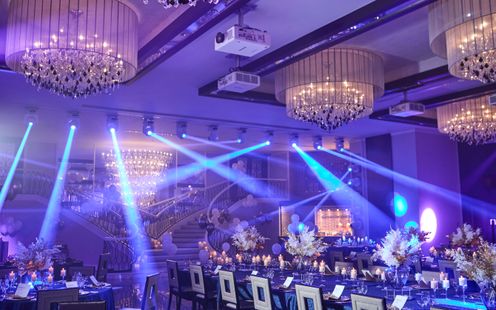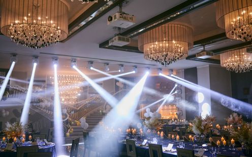 同ホテルで一番人気のワンフロア貸切可能なエレガントな会場。バーカウンターやオープンキッチンもあるのでゲストのおもてなしに華を添えます。最新のライティング演出や大階段からの入場演出もでき、映画のワンシーンのような入場もできると人気です。天井高もあるので、チアリーディングなどの演出やバンドを入れることもOK。会場の四方面にスクリーンがあり、迫力の映像演出も叶います。