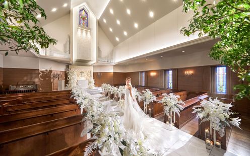 地上51mの屋上に建つ独立型チャペル。目の前にはガーデンがあるので大空のもとでのフラワーシャワーも叶います。真っ白な大理石のバージンロードにふたりの姿が映り込む姿はとても美しく、バージンロードは横幅もあるのでドレスのトレーンもきれいに映えると花嫁さまからも好評です。