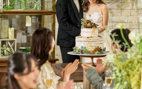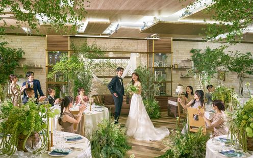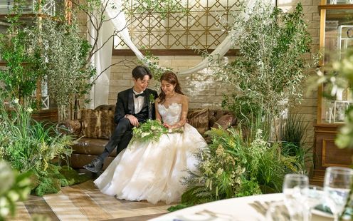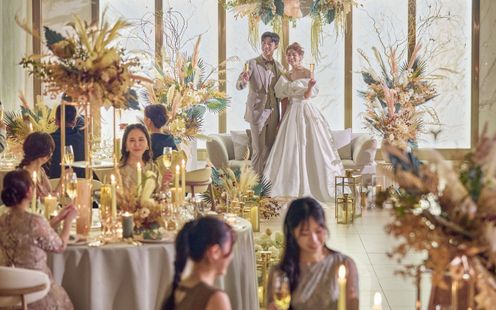 ナチュラルとモダンが融合したパーティ会場。コーディネートで表情が変わるので、カジュアルから和モダンまでふたりの好みを表現できます。4つの香りからセレクトできるフレグランス演出や、よりゲストと一緒に楽しめるようにメイン席をソファ席することもおすすめです。
