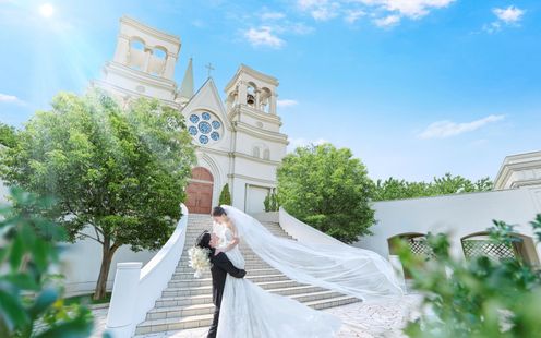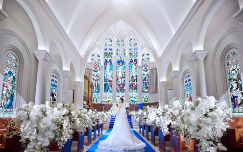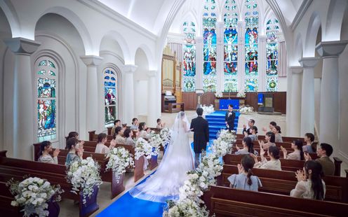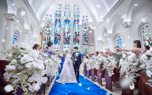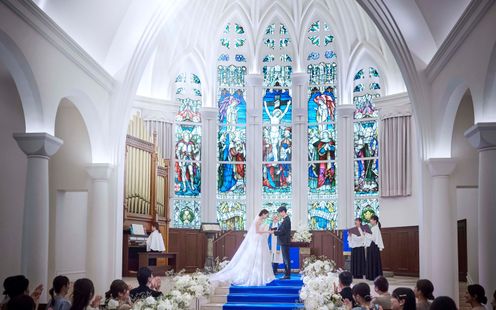 閑静な街並みにそびえ立つ白亜の独立型チャペルは、天井の高さ11m、バージンロードの長さ20mを誇る大聖堂。ここはドラマに登場したこともある人気チャペル。『永遠に続く』という意味を持つロイヤルブルーのバージンロードでは純白ドレスが美しく映え、見守るゲストから感嘆の声も。祭壇には英国の教会で時を刻んだステンドグラスやパイプオルガンを備え、本格的な厳かなキリスト教式が叶います。挙式後は大階段で大勢のゲストに見守られながらフラワーシャワーの祝福を。また、家族の一員であるペットも挙式に参列いただけますので詳しくはお問い合わせください。