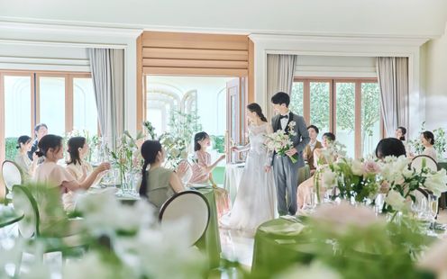 緑や花のナチュラルな美しさを光で表現した「ヴィラ フルーリ」。降り注ぐ自然光と、眺めの良いガーデンが広がり自然とリラックスできます。四季折々の花々が咲き誇るプライベートガーデンは開閉式のルーフ付き。前室に用意されたバーカウンター、ガーデンのシンボルリースやフォトコーナーではゲストと一緒に楽しむアットホームな演出を提案します。屋内とガーデンを行き来できる開放的な雰囲気が、ゲストの心を和ませて自然に一体感が生まれます。ピアノやスクリーンも2面備えていますので演出もお楽しみください。