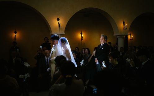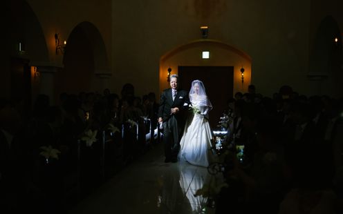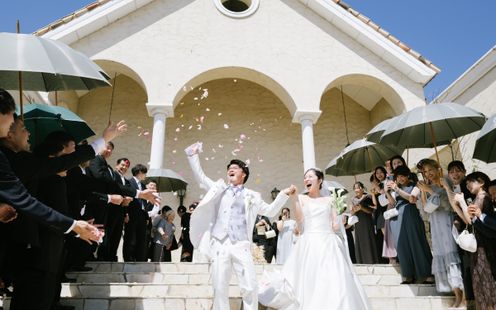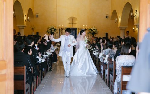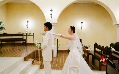 天井高15m、なだらかなアーチに映るやわらかな光。美しい讃美歌が響く中、きらめく笑顔と祝福に包まれてアットホームなセレモニーが叶います。挙式後はエリア屈指の大階段で青空のもと、盛大なフラワーシャワーやバルーンリリースをお愉しみいただけます。