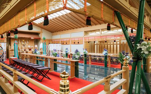 最上階に位置する館内神殿は宮大工を用いた厳粛な造り