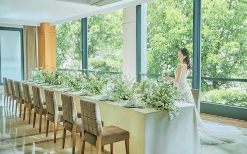 表参道の象徴であるケヤキ並木のまばゆい緑のシャワーと、大きな窓から差し込む木漏れ日に包まれたバンケット。春夏秋冬それぞれで表情を変える自然のぬくもりが、大切な記念日を祝福します。表参道の自然とのつながりを感じながら、明るく居心地のよい時間を過ごせるナチュラルテイストの空間です。