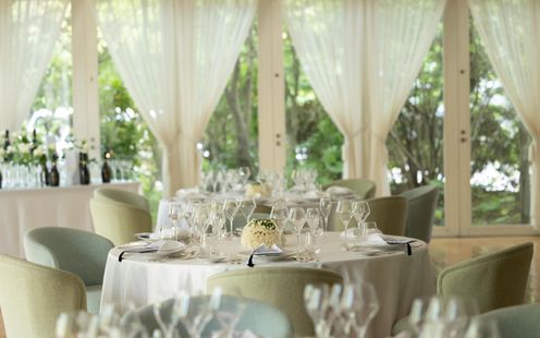 天井高が5m以上ある開放感あふれるパーティールーム「メゾン・ド・ロゼ」。 大階段から降りてくるふたりを祝福のまなざしと拍手が迎えてくれます。 隣接する花と緑に囲まれたガーデンでは爽やかな木漏れ日の中でケーキカットやデザートビュッフェをお愉しみいただけます。ゲストと自由に動けるスタイルでリゾートならではの寛ぎあふれるウェディングを。また、家族だけの結婚式にも最適な少人数向けの会場セッティングも叶いますので気軽にご相談ください。