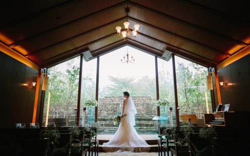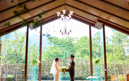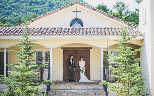 軽井沢の雄大な山々が幸せなふたりを見守る教会