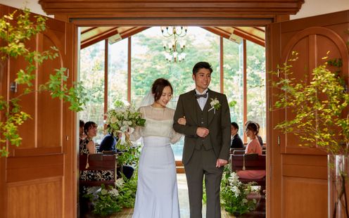 軽井沢の雄大な山々が幸せなふたりを見守る教会