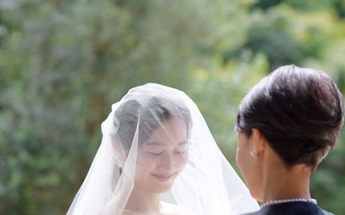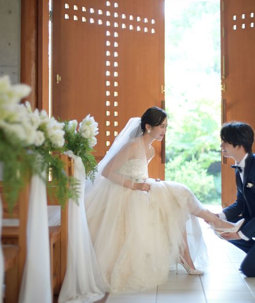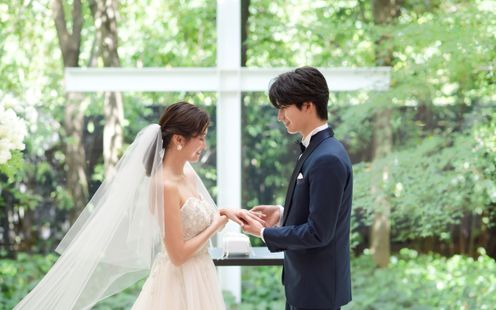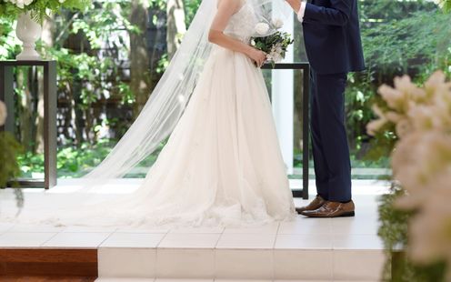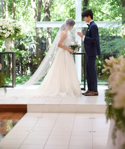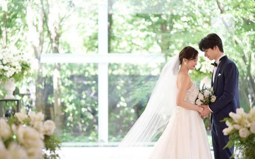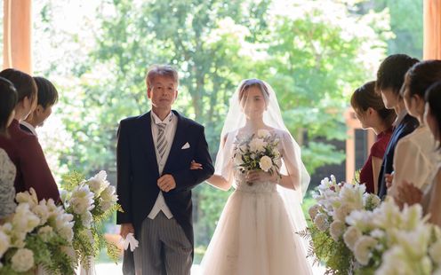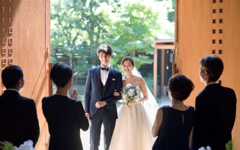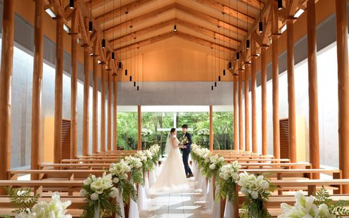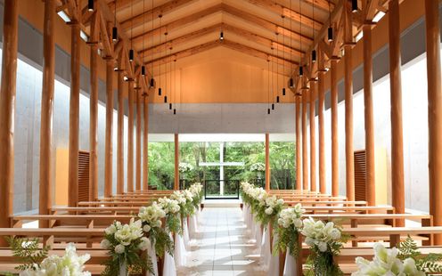愛を誓う神聖な儀式は、緑と陽光あふれるチャペルで。木目が美しい温かな挙式