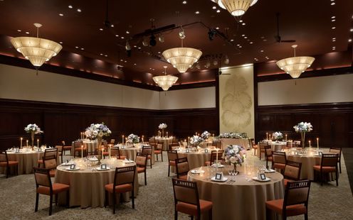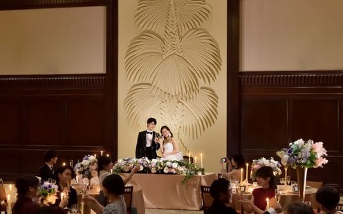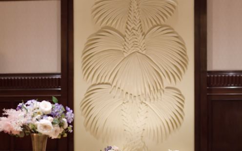 熊本最大級の広さを誇る大空間が魅力。天井まで続くパームツリーのレリーフが印象的で、「末永く支え合い成長していく夫婦の姿」を象徴します。アンティーク調の壁と木の温もりが調和した、落ち着きある空間は人数に応じて広さを調整できる柔軟さが魅力。演出の自由度も抜群で、披露宴中に花火を取り入れたカップルもいるなど、ふたりらしいサプライズが叶います。