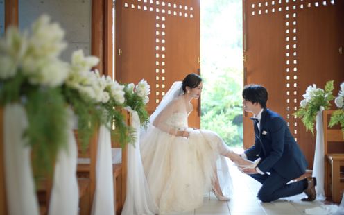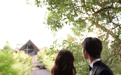 緑に包まれた石畳の道を静かに進むと現れる、祝福の時を待つ教会。木のぬくもりと穏やかな光に包まれた静寂な空間が広がり、バージンロードが続く先には純白の十字架が見守ります。永遠の誓いを交わすにふさわしいナチュラルな雰囲気です。挙式後は青空の下、フラワーシャワーなどの自由な演出を楽しめます。