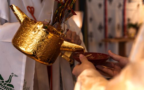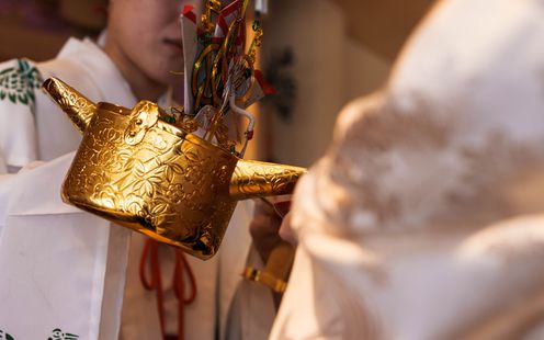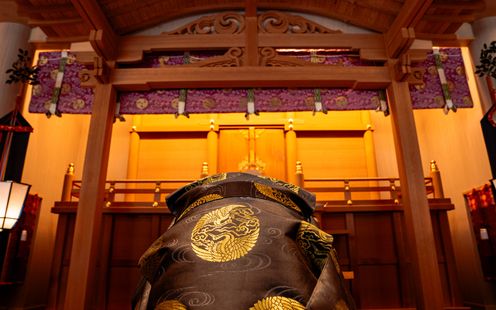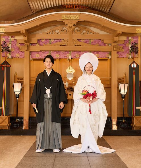 大空をバックにした水に浮かぶ本格神殿もグランドオープン!石の回廊での和装記念フォトも絵になる空間です。さらに提携先である「武蔵一宮 氷川神社」で古式ゆかしい神前式も叶います。氷川参道での前撮りも可能ですので気軽にお問い合わせください。