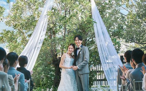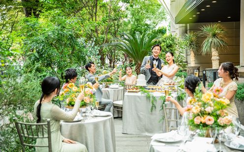 ガーデンテラスでは絶好の景色を愛でながらの開放感あふれるセレモニーをはじめ、海外リゾートに訪れたかのようなバーカウンター付きの広々としたスペースでゲスト同士もリラックスできるひとときをお過ごしいただけます。シンボルツリーのもとでゲストとの記念撮影や、ウエルカムパーティ、デザートブッフェなど、自由な演出でおふたりらしいおもてなしが叶います。