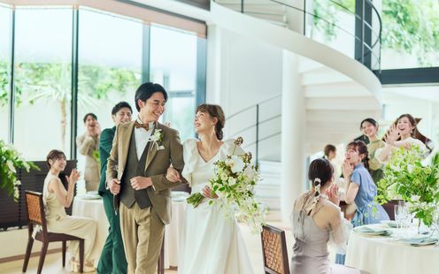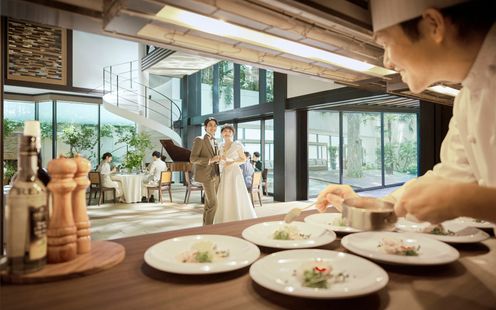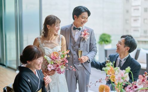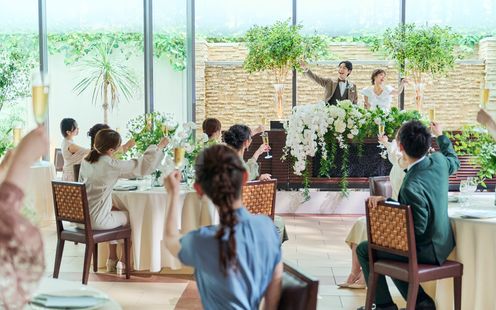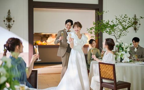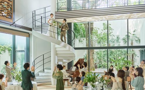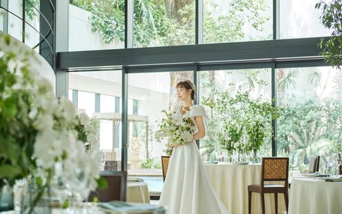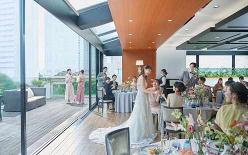 サンルームから射し込む温かい自然光が、ニューヨークをイメージしたラグジュアリーな空間を包み込みます。親族と親しい友人だけを招くパーティだからこそ雰囲気もおもてなしも妥協したくない、そんなおふたりにおすすめの空間です。明るい陽射しが降り注ぐガーデンテラスではパーティ前のひとときを。記念撮影をしたり、おしゃべりをしたり、自由にお過ごしください。