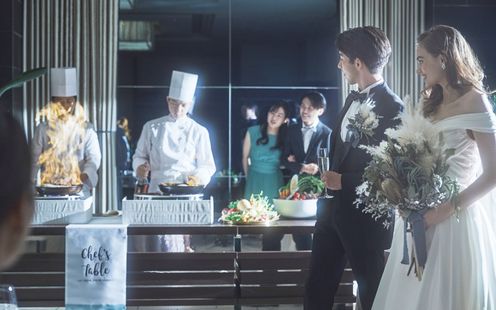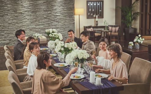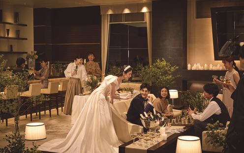 ダークウッドと天然石のシックな設えがオリエンタルな雰囲気を漂わせる「アジアンスイート」は、大人のリラックスパーティにおすすめ。専用キッチンから運ばれる出来立ての料理をゲストと囲んで語らう時間は何よりのおもてなしに。また、同フロアでは会場隣接の贅沢な雰囲気のスイートロビーも貸切!天蓋付きのソファが備わった広いロビーもこだわりのスイーツやハイセンスな装花で彩り、優雅な楽園へゲストを迎えよう。会場と自由に行き来してゲストにゆったり寛いでいただけます。バーカウンターでドリンクを手に思い思いの場所で語らい、生演奏やフォトタイムなど好みの演出でゲストとのふれあいの時間をお愉しみいただけます。