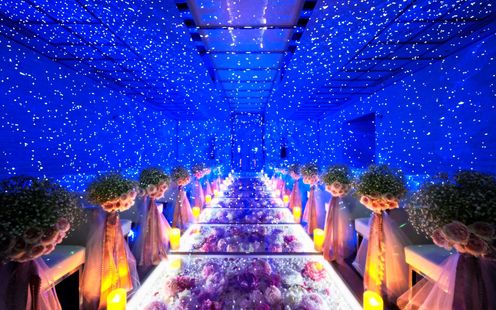 花々に彩られたロマンチックなバージンロード。星空の映像演出の中でロマンチックな挙式を