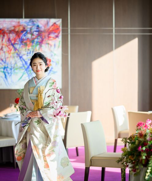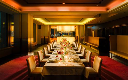 皇居や東京タワー、そして晴れた日には富士山までを望む、開放感あふれるパノラマビューのメインダイニング。刻一刻と表情を変える空と景色は、それ自体がゲストへのおもてなしに。昼の爽やかな光、夕暮れの美しいグラデーション、夜景のきらめきまで、特別な一日をより印象深く彩ります。ドレスも和装も似合う空間なのでお色直しも楽しんで!