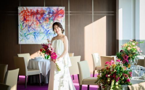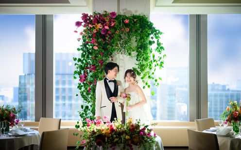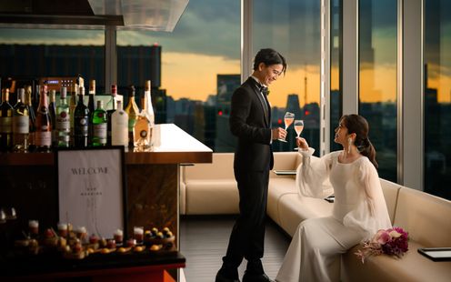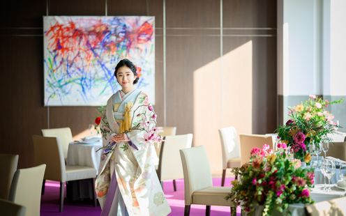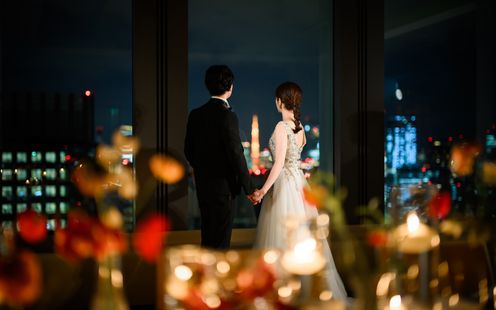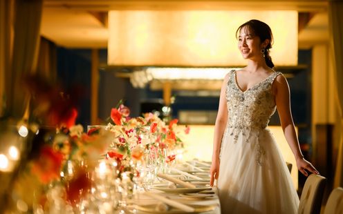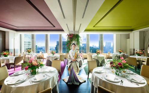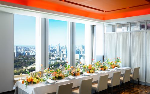 皇居や東京タワー、そして晴れた日には富士山までを望む、開放感あふれるパノラマビューのメインダイニング。刻一刻と表情を変える空と景色は、それ自体がゲストへのおもてなしに。昼の爽やかな光、夕暮れの美しいグラデーション、夜景のきらめきまで、特別な一日をより印象深く彩ります。ドレスも和装も似合う空間なのでお色直しも楽しんで!