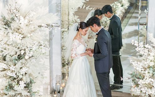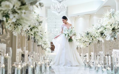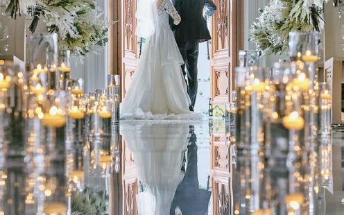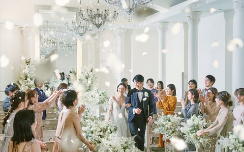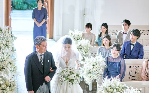 扉を開いた瞬間目に飛び込んでくる大理石でできた純白のバージンロード、その上で煌めく無数のクリスタルはふたりがこれまでの人生で出会った大切な人たちを表しています。ふたりの歩みやシーンに合わせて照明が変化するなどの演出も思いのままにお愉しみいただけます。また、挙式前にスタッフが親御さんをチャペルの外まで案内し、扉が開くと家族の対面の時間をセッティングした「ファーストミート」も実現。ふたりと親御さんだけで家族水入らずの時間を過ごせるので、ゆっくり感謝の気持ちをお話いただくことができます。