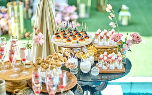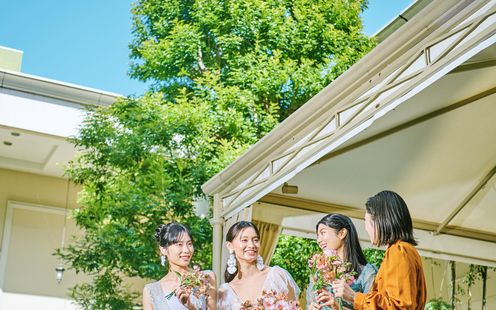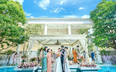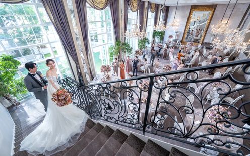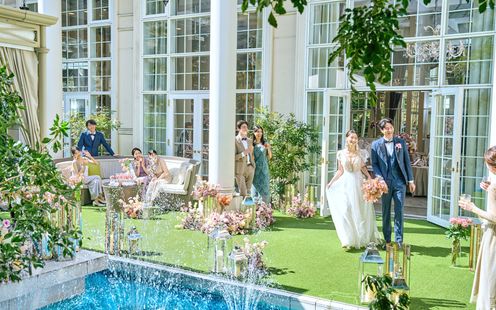 プール付ガーデンではウエルカムパーティや、パーティ後半にデザートビュッフェ、フォトタイムを愉しむなどガーデンの使い方はふたり次第!豪華なシャンデリアが印象的なパーティ空間には憧れの大階段入場も実現!華やかな晩餐会風パーティが叶う贅沢な雰囲気とオープンエアのカジュアルな開放感、どちらも両立した空間は憧れを叶えるふたりの特別の一日の舞台に。
