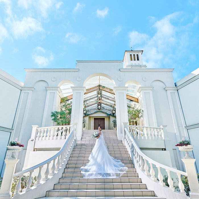 【ロイヤルブルーが美しい大聖堂で入場体験】エリア屈指の大きさを誇る大聖堂は女性の憧れそのもの。ドレスが映えるバージンロードはゲストからも大人気。■天高15m■バージンロードの長さ18m■120名着席