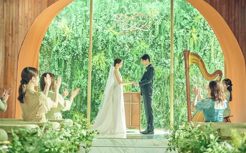 3面ガラス張りの窓から降り注ぐ光あふれる憧れチャペルがリニューアル!森の中にいるかのような木の香りとハープ&フルートの生演奏包まれて、永遠の愛を誓いあう挙式。また、ふたりらしい言葉で感謝の気持ちを伝えるオリジナリティあふれる人前式も思い通りに。開放感ある空間がふたりの表情をさらに美しく引き立たせます。