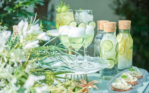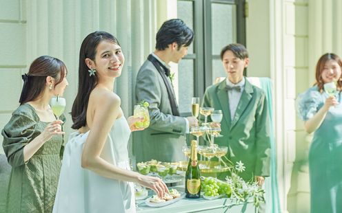 訪れたゲストをもてなすウェルカムドリンク&フィンガーフードも、式の印象を左右するディティール。ふたりの大好きなドリンクを添えてこだわりを感じてもらったり、可愛らしいワンスプーンフードでセンスの良さを魅せたり。ゲストの顔ぶれに合わせた選べるブッフェも多彩に可能です(野菜・ケーキ・紅茶・チーズ等)。細やかなおもてなしはきっとゲストに満足していただけるはず。