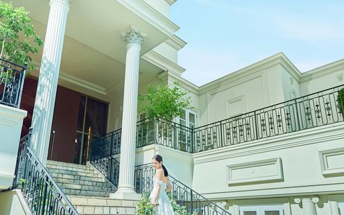 上質ながらあたたかみのある会場では、アットホームな雰囲気の中、ゲストと笑顔でリラックスした時間をお過ごしください。会場の両サイドに豪華に広がる大階段からの入場もおすすめです。すぐ隣にはプール付きのガーデンがあるのでゲストと笑顔あふれる演出をお愉しみいただけます。