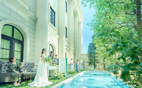 プール付きガーデンのあるパーティルーム。お姫様階段からの入場も叶う光あふれる空間