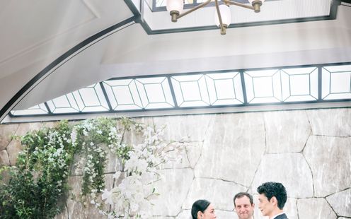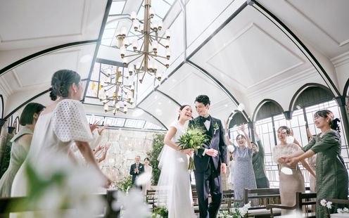 昨年リニューアルしたチャペルは、美しい模様があしらわれたステンドグラス&天窓から自然光が降り注ぐ透明感あふれる上品な空間。祭壇奥の御影石には清らかな水も流れており、モダンなデザインなので和装もドレスも美しく写真映えします。挙式は、荘厳に響くパイプオルガンとバイオリンの音色のなか、牧師の導きにより感動セレモニーが執り行われます。また、ペットとのリングドッグ演出なども叶いますので気軽にお問い合わせください。