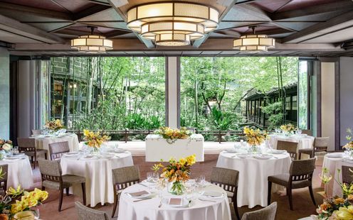 大きな窓から竹林の爽やかな庭園の景色が広がる空間
