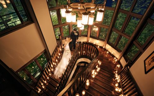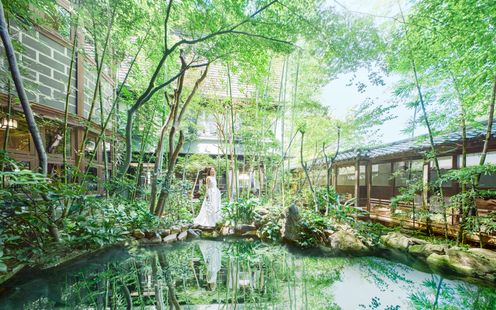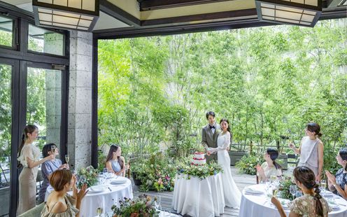 最新トレンドを取り入れながら、長く愛し続けていただけるような内装デザインにこだわったモダンな空間。ドレスも和装も映える、日本らしい艶やかなデザインは寛ぎと落ち着きを演出します。緑豊かなお庭を眺めることができるプライベートテラスを併設し、ビュッフェやテラス入場などの演出も幅広くお楽しみいただけます。