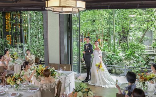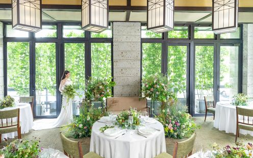 緑豊かな絶景が目の前に広がる、上質かつ落ち着いた雰囲気の披露宴会場。都会にあることを忘れる開放的な非日常空間で、特別な一日をお過ごしいただけます。ガーデンをバックにしたテラスからのサプライズ入場は、特に人気の演出。併設したオープンキッチンからは、香り立つ出来立てのお料理を最高の状態でお届けいたします。