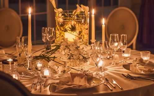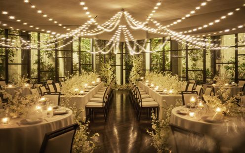 自然光の入る広々とした会場はゲストとゆったり楽しむ大人のパーティにおすすめです。会場にはミニキッチンがあり、シェフのフランベ演出などでライブ感ある美食のパフォーマンスをお楽しみいただけます。無数の光がつくり上げる幻想的な空間で、ワンランク上のお洒落なパーティが叶います。