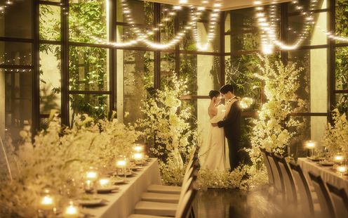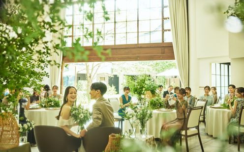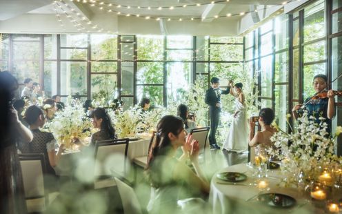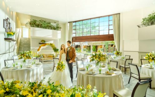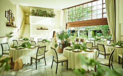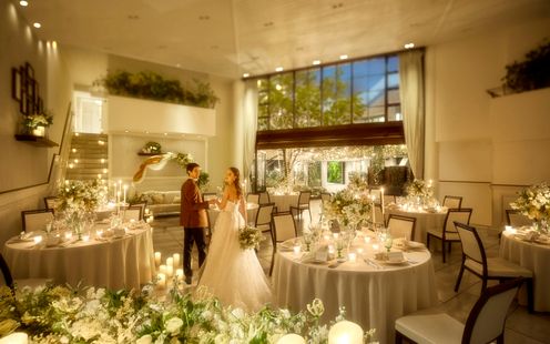 大きな窓から優しい光が差し込み、吹き抜けの天井が開放感あふれる空間を演出。また、ガーデンとひと続きなのでゲストと寛ぎに満ちた動きのあるパーティが叶うのが魅力!アフターパーティでは、ガーデンでゲストとビュッフェを囲んでプライベートな時間をたっぷりお楽しみいただけます。コーディネート次第で空間の雰囲気も一変しますのでデイタイム、ナイトタイムでお好みの色でアレンジを!