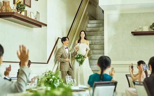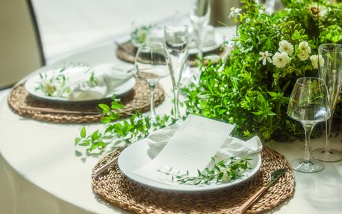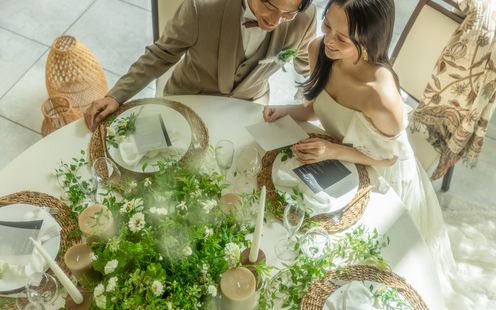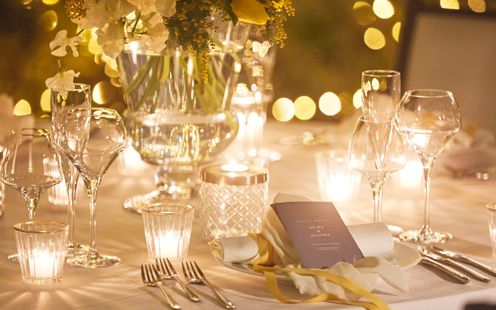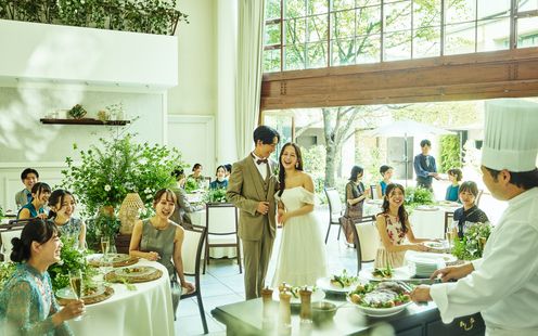 幅広い年齢層のゲストに満足いただけるように、日本人が親しみ慣れている和出汁でご用意したり、ナイフフォークではなくお箸で食べてもらう事が可能なフレンチを提供いたします。上品でありながらどこか懐かしい料理で、ゲストへ最幸のおもてなしが叶います。また、ガーデンテラスで行うビュッフェの種類も豊富な品ぞろえ。シェフがゲストに直接お肉を振る舞うグリルビュッフェや、チーズフォンデュ、お寿司バー、ひつまぶしビュッフェなどふたりの想い出の地にちなんだビュッフェメニューも対応いたします。