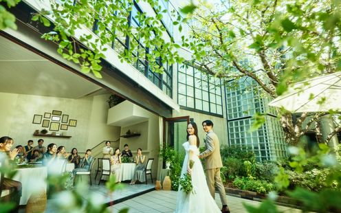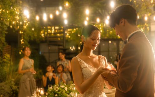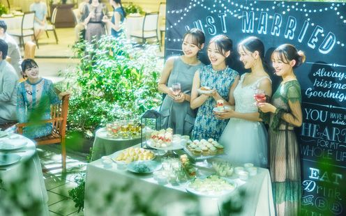 足を踏み入れるとまず目に飛び込んでくるのは、緑に包まれた開放的なガーデン。木漏れ日が心地よいガーデンパーティの魅力を存分に味わってください。挙式の後には、定番のフラワーシャワーやシャボン玉を使用したバブルシャワーなどの演出以外にも、ゲストとビュッフェを囲んでプライベートな時間をたっぷり楽しめるウェルカムパーティも可能です。また、ナイトタイムにはキャンドルやランタン演出で幻想的なひとときを。