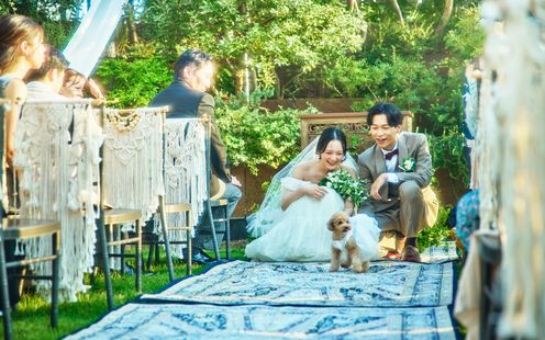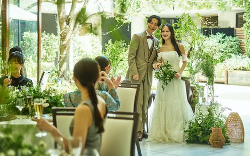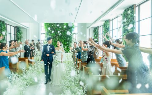 木目調のあたたかな雰囲気のチャペル。屋内とはおもえないほどの緑と自然光に満ち溢れた神聖な空間で厳かな挙式が叶います。挙式後はテラスを使用してアフターセレモニーもOK!定番のフラワーシャワーや、シャボン玉を使用したバブルシャワーなど、挙式の緊張が解けてゲストと笑顔溢れる時間に。また、ペットも挙式に参列していただけます。時間によっては1日可能な場合もあるので詳しくはスタッフまで気軽にお問い合わせください。