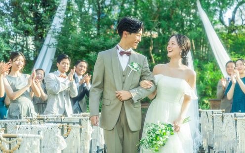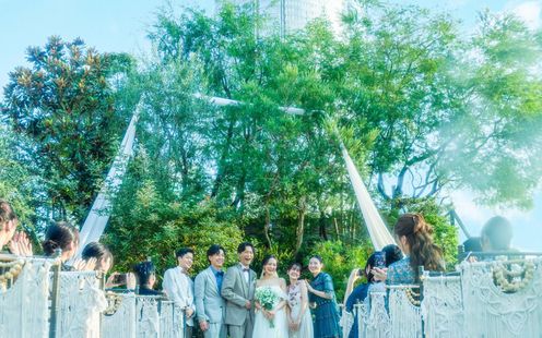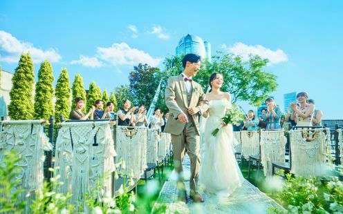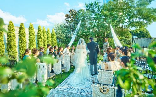 青空の下で永遠の誓いを交わすガーデンチャペル