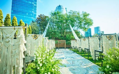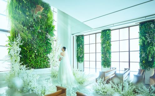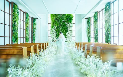 大理石のバージンロードとグリーンウォールの洗練された空間