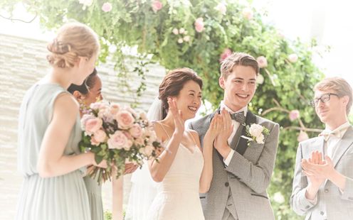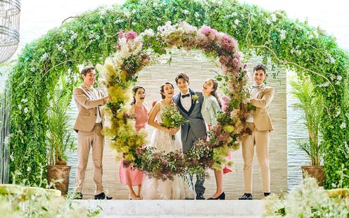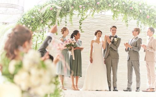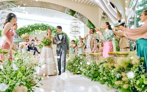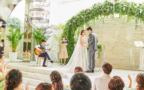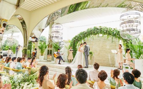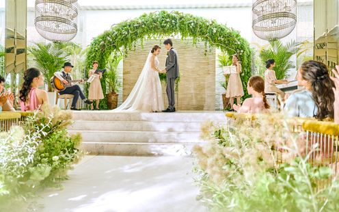 天神上空40mに位置する、ガラスをふんだんに使った開放感あふれるチャペル。空から降り注ぐやわらかな光、鮮やかな緑、水のせせらぎに包まれた、自然の中にいるような空間に一目惚れする花嫁多数!ここが天神であることを忘れてしまう、街の喧騒を全く感じさせない秘密の楽園のような雰囲気は、おふたりの緊張をほどいて素敵な笑顔を引き出してくれます。アコースティックギターやバイオリンが奏でる祝福のメロディが響く中、温かく感動的なセレモニーをお迎えください。120名まで着席できるので、大切なゲスト全員にふたりの誓いを見守ってもらえるのも魅力のひとつ。また愛犬の参列や挙式後のオープンエアなルーフトップでのアフターセレモニーも人気です。
