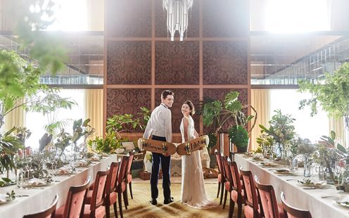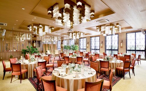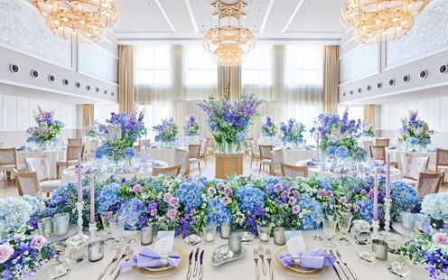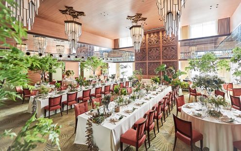 大きな窓からの心地よい風と光が差し込むリラックス空間。開放感を感じる高い天井とラグジュアリーなシャンデリアが特徴的なバンケットです。オープンキッチンを併設し、ゲストの目の前で料理が仕上げられることで、披露宴の特別な瞬間に華を添えることができます。ワンフロア貸切で、リュクス&リラックスなひとときをゲストと一緒にお楽しみください。