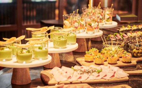 ラウンジで待つゲストに、ドリンクやフィンガーフードでくつろいでいただきます。また1Fにクロークがあるのも魅力のひとつ。おふたりと大切なゲストの「旅」の始まりです。