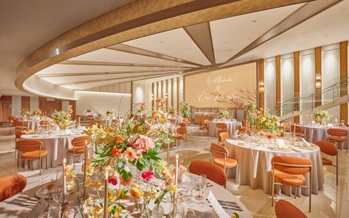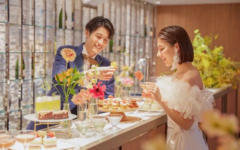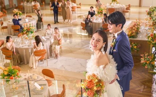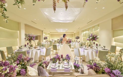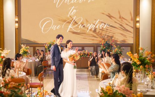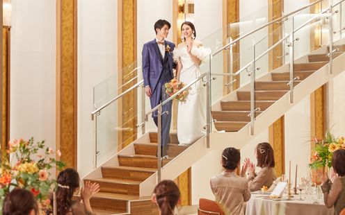 二人の大切な人を招いてゆったり過ごせる開放的な広々空間。ゲストを釘付けにするのは巨大シアターのような大迫力のパノラマ映像。プロフェッショナルなスタッフが映画のようなドラマティク映像を制作しゲストを大興奮に包みます。さらに内階段から華やかに登場し、温かな拍手と祝福を受けながら会場へ。華やかなエンターテインメントスタイルから、落ち着いた大人の雰囲気まで、ふたりの想いに合わせて自由にコーディネートできます。