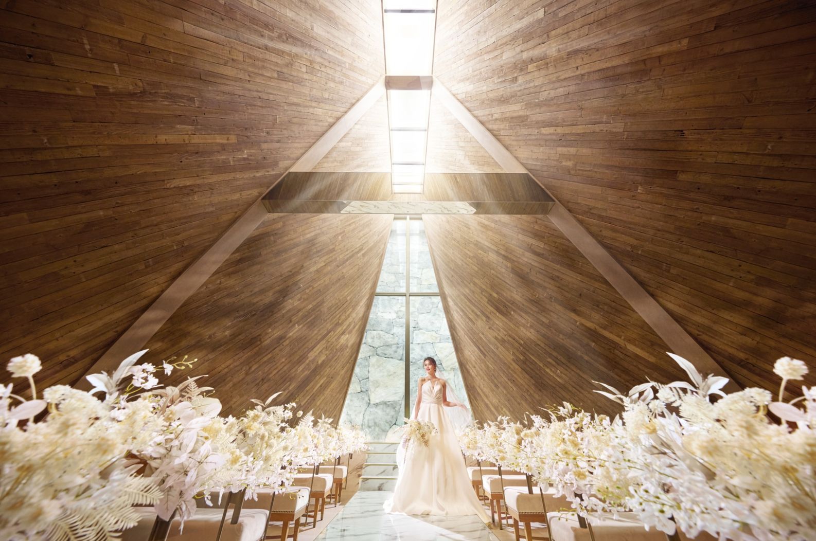 02.<木のぬくもり感じるチャペル>天井高10mのチャペルに響き合う光・水・音のハーモニー