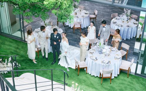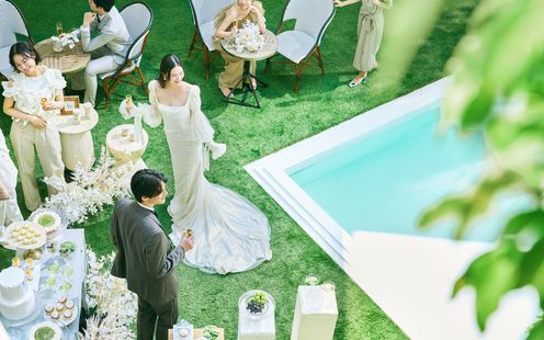 挙式後はチャペルから続く外階段を下りて盛大なフラワーシャワーを。ガーデンの使い方はふたり次第なので、プールを使用してドロップ&フライや、バルーンリリースなどもお楽しみいただけます。ペットと一緒に記念撮影も可能です。また、パーティ後半には屋外にシェフズキッチンをアレンジして料理パフォーマンスを楽しんだり、デザートビュッフェを囲んで歓談タイムを設けたりして、ゲストとリラックスしたひとときをお過ごしください。