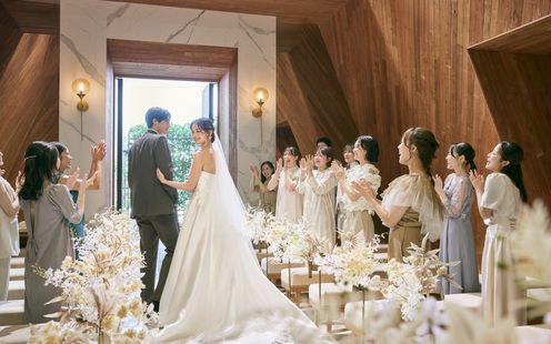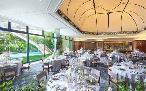 一般的な『披露宴会場』の考え方から、大切なゲストを愉しませる『ゆとりある上質な空間』へ。パリの5つ星ホテルを彷彿とさせる空間は、違いのわかる大人たちにも安心してお寛ぎいただけます。広々としたクラシックなフロアを、存分にご活用ください。また、式の進行に合わせてオープンキッチンから提供されるあたたかなお料理や、隅々まで行き届いたきめ細かいサービスは、1施設1バンケットだから叶う、あなただけのウェディング・タイム。すべてがオーダーメイドで創り上げられた最上級のおもてなしが格上げされた大人のウェディングを演出してくれます。また、ガーデンに隣接しているのでパーティ後半は屋外でデザートビュッフェを囲んで会話の弾むパーティを。ガーデンではペットも一緒にお過ごしいただけます。
