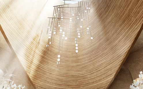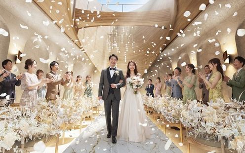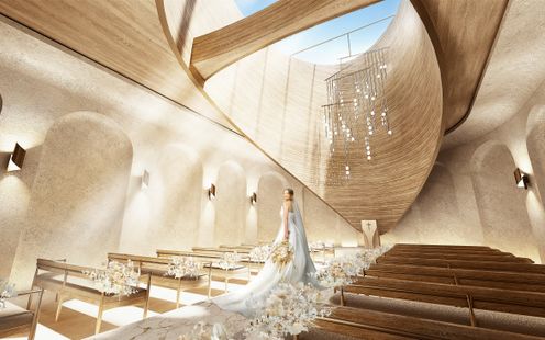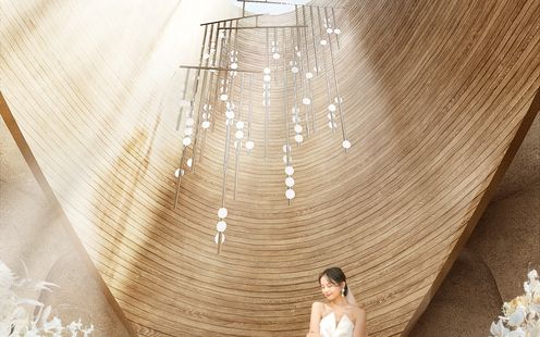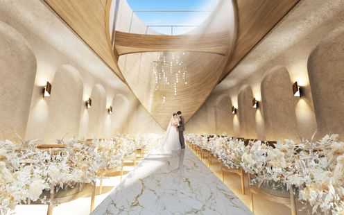 天井高10m、空へ抜ける広がりを感じさせる木のドロップウォールが印象的。天空から降り注ぐ光が、時間によって異なる表情でチャペルを彩り、その日だけの特別な空間を創り出します。ドレスのドレープを魅せる、段差のあるランウェイ型バージンロードも魅力。スタイリッシュかつナチュラルな美しさが誓いを結ぶ、ふたりのはじまりの瞬間をそっと祝福します。(完成予想図)