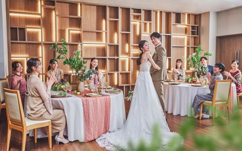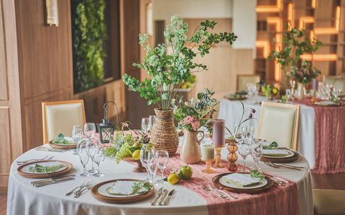 無垢材やモスグリーン、アッシュウッドカラーを基調としたナチュラルテイストのバンケット。