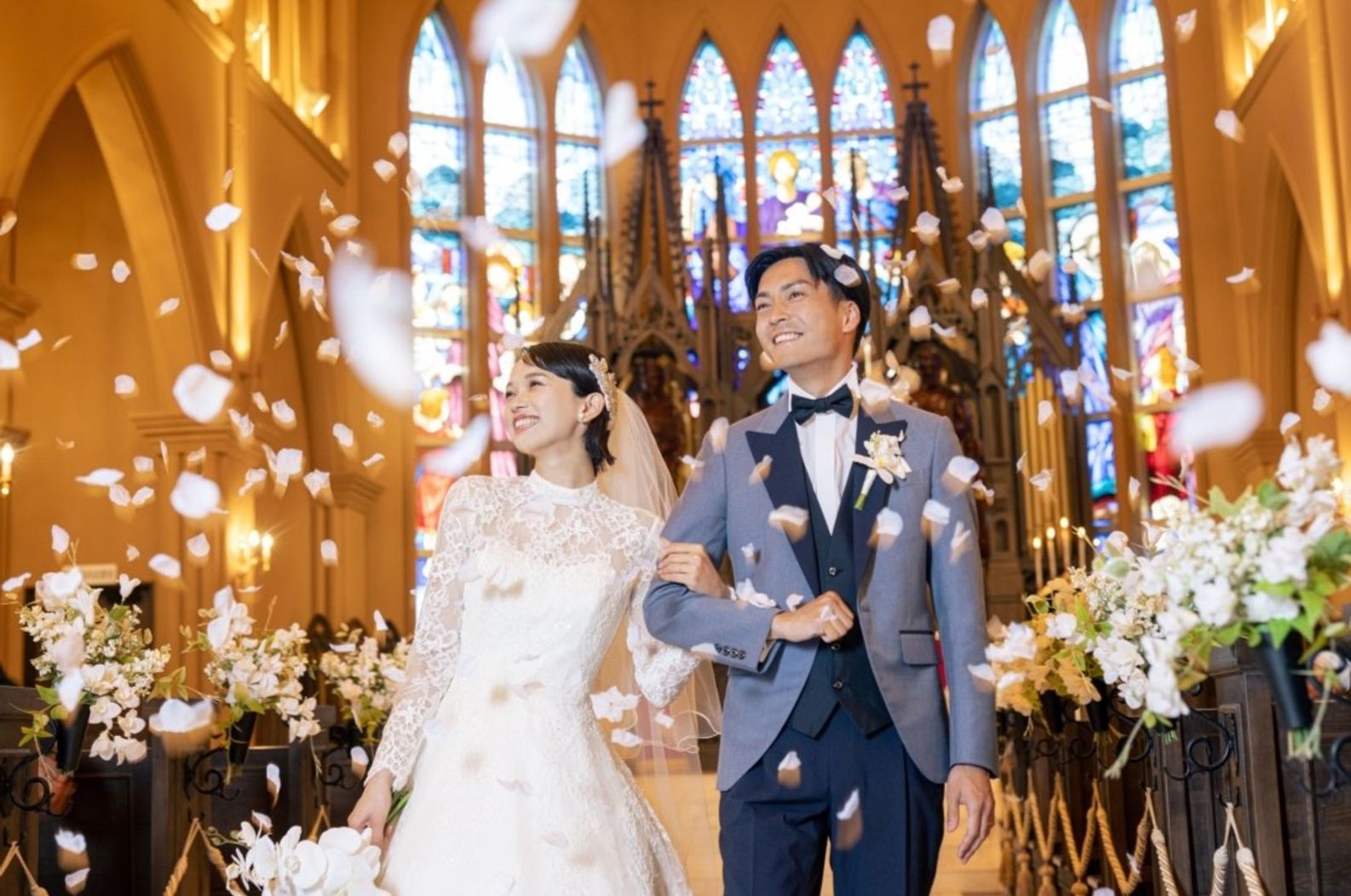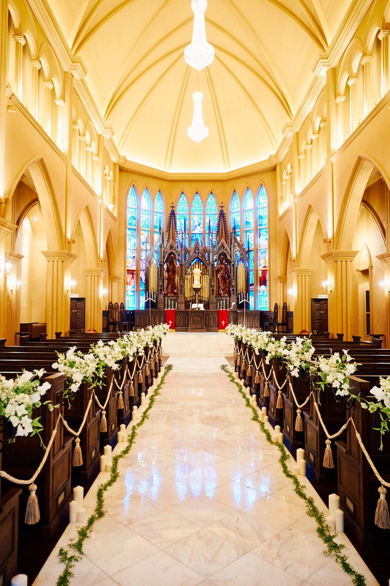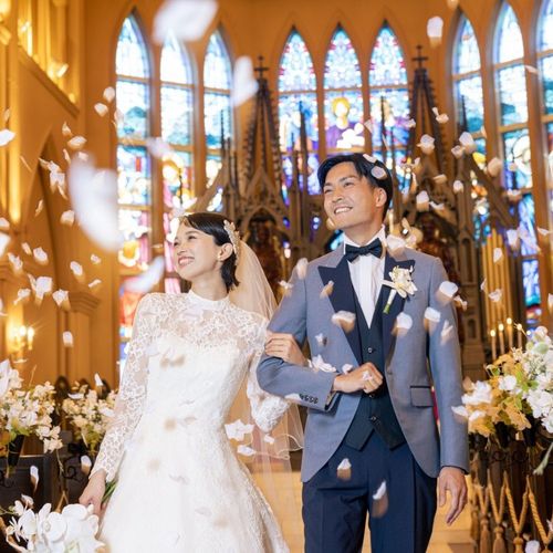 01.壮麗なステンドグラス輝く本格大聖堂で感動セレモニー。式後は大階段でフラワーシャワーを