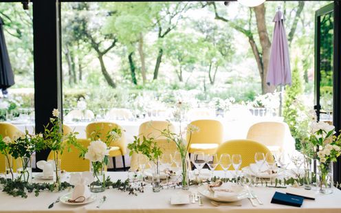 3階建てのレストランをまるごと貸切にできるから空間演出も自由自在。3つのパーティスペースから好みの空間をお選びいただけます。また、テーブルレイアウトからエントランスの飾り付け、メインテーブルをソファにするなどふたりの希望にそってアレンジいたします。1階にはガーデンテラスを併設しており、日比谷公園にも窓を開け放つとひと続きなのでオープンエアの心地よい雰囲気を感じられます。料理パフォーマンスもふたりのおもてなしスタイルにあわせてお手伝いいたします。
